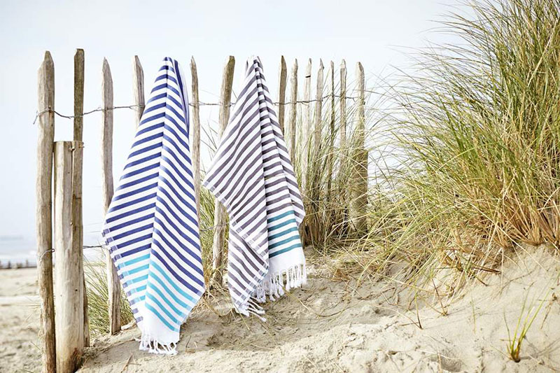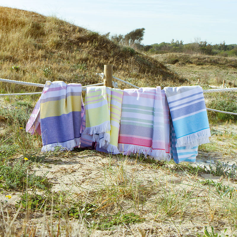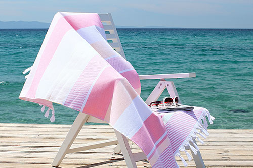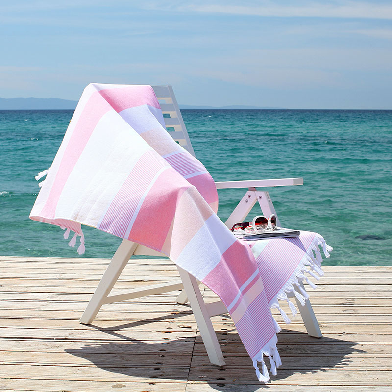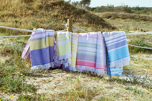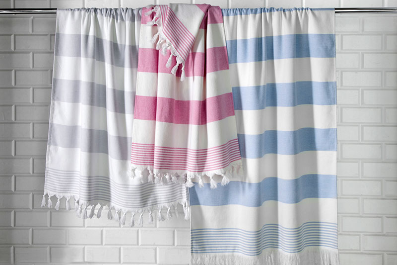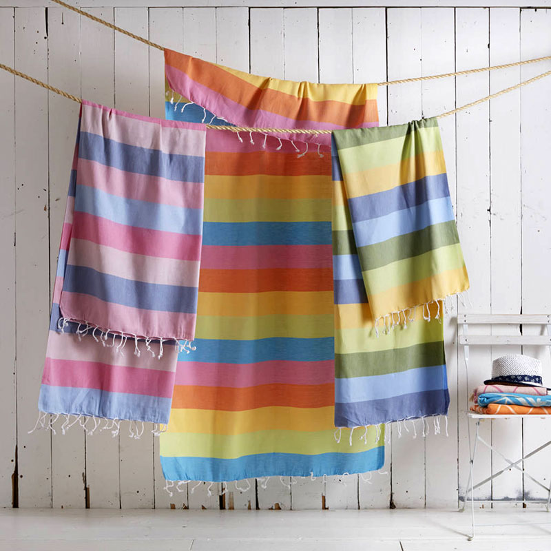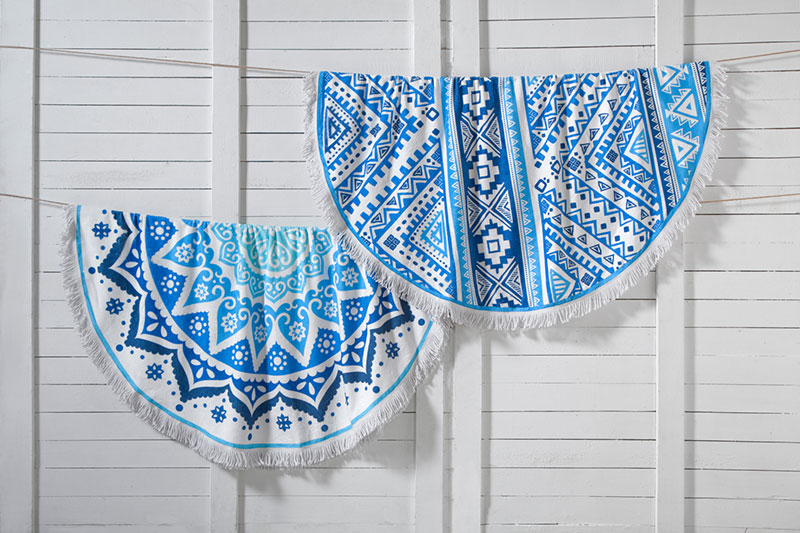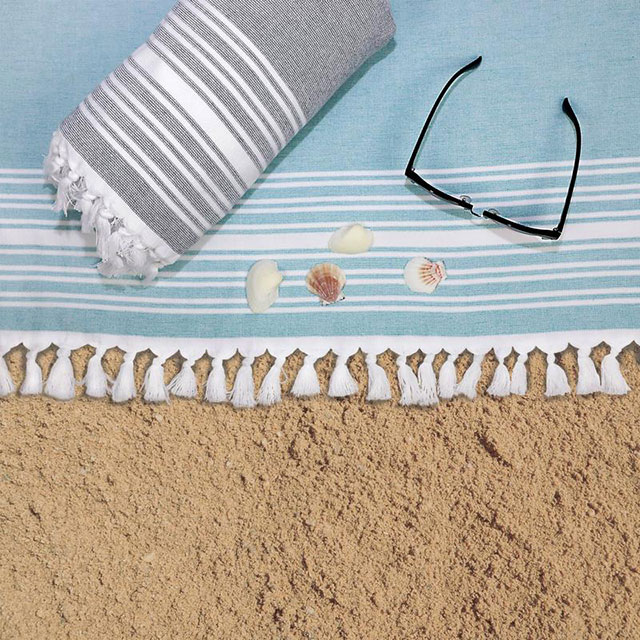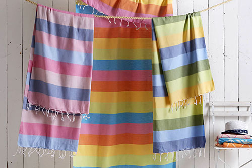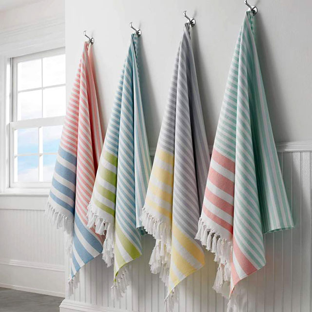 Flat woven decorative front with terry loop back, Trimmed with bi-colored eyelash fringe & Features sewn in hanger loop.