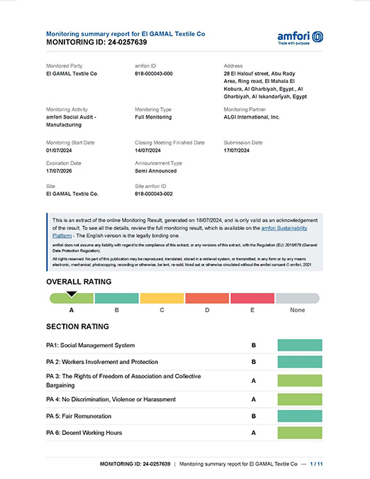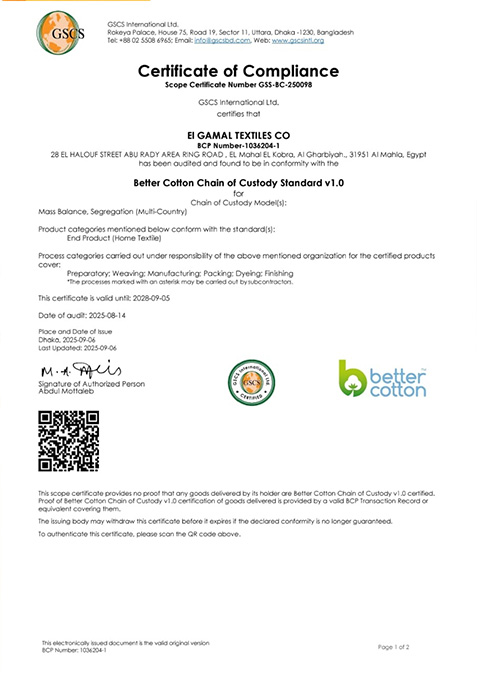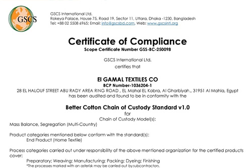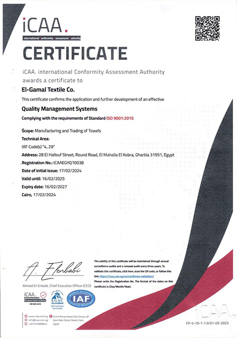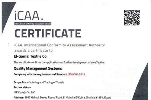 Over the years, EL GAMAL TEXTILE CO. has obtained many certificates in the field of textile, especially the towels & bathrobes.